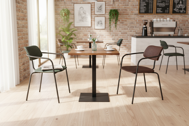 Inspired by contemporary European design, this set marries sleek metal frames with plush upholstered seats in sophisticated hues like deep green and rich brown. The warm wooden tabletop complements the metal’s industrial-chic appeal, striking a balance between modernity and timeless elegance. Whether your venue leans into a rustic brick-walled cafe aesthetic or a bright, airy hotel dining space, this set seamlessly integrates, elevating the overall visual narrative.